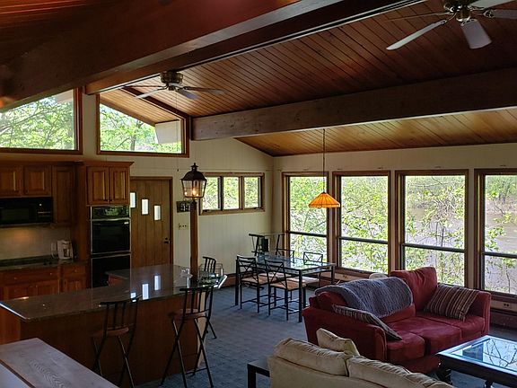Vacation at home. $3000/month, utils included. Secluded riverfront chalet on the Delaware. This is a beautiful house right on the Delaware River on a quiet street in a quiet town about an hour from NYC and Philly. A riverfront oasis high on the banks of the Delaware, you will soak in the natural surroundings of this gorgeous chalet perched 50 feet above the majestic Delaware River. The living area comprises an open concept kitchen, dining, and living space all sharing sweeping views through the floor to ceiling windows, revealing the natural beauty of Whipporwill Island nestled in the middle of the flowing water. Gather around the large kitchen island, sit down in the adjacent dining area, or enjoy the coziness of the living room fireplace, all with soaring cathedral ceilings. The huge first floor bedroom has it's own full bath and a cedar closet, plus access to the laundry room. Upstairs the equally large master suite boasts another full bath and sitting area. Step outside from the kitchen and dining area onto a wooden deck then down to the slate patio, both shaded by mature trees giving you a chance to feel the refreshing breeze coming off the water. Large screen TV with Chromcast. Pots, pans, silverware, coffee maker, glassware, etc. Washer and Dryer Gas grill. Private deck off the kitchen. Outdoor tables and seating Direct access to walk down to the river for fishing, tubing or boating. Available 1-1-2021 through 4/30/2021 at the above rate. Shorter or longer monthly periods may be available. $2997/month utilities included Available 1/1/21 to 4/30/21. Landlord pays all utilities including wifi. Pets must be house-trained. No smoking inside the house!!