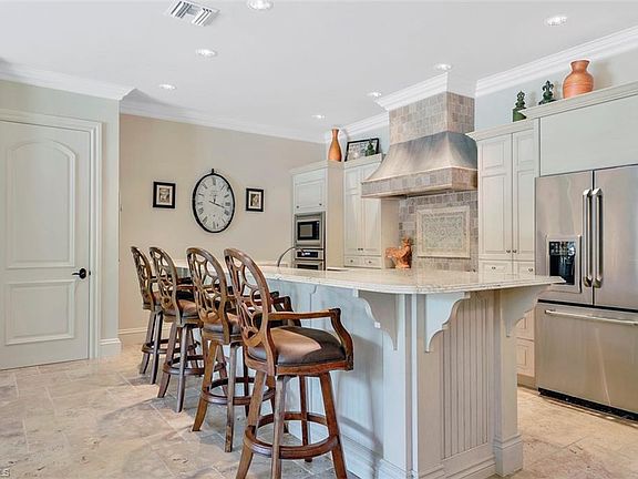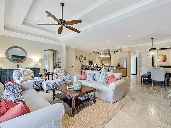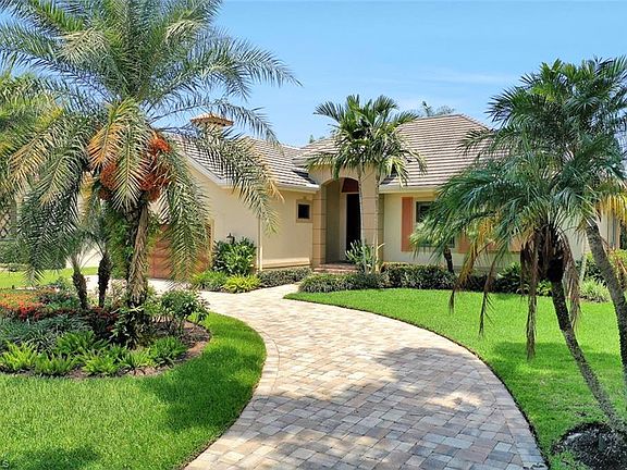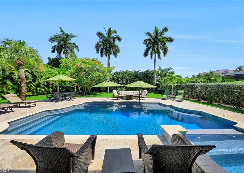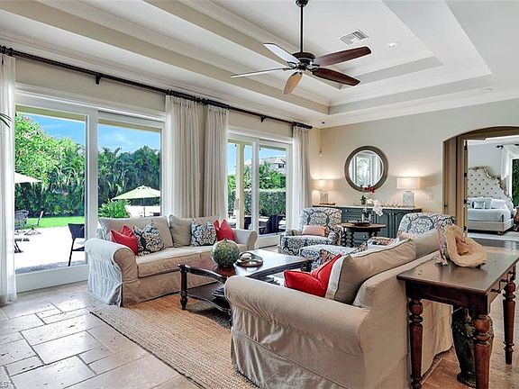 H.14786 An elegant & inviting one level home, built in 2013 and located in the heart of the Moorings on beautiful tree-lined Riviera Drive. This exceptional property welcomes you with a soaring 14' entryway leading to a bright, open plan living area overlooking the expansive .39 acre grounds. Highest quality finishes throughout, including honed natural stone flooring, Anderson impact glass windows & doors, double tray ceilings, & stunning cabinetry and trim. The kitchen features a Thermador oven, induction cooktop, & farmhouse sink. Other great features include a tranquil master suite with double walk-in closets, & a spa-like bathroom. THE OUTDOOR LIVING AREA IS SPECTACULAR with a spacious covered lanai overlooking a 35' pool with sunshelf & integrated spa. All surrounded by a lovely natural stone patio and spacious fenced back lawn with flowering Frangipani tree. Private beach access & parking is available to Moorings property owners through the Moorings Property Owner's Association. See Remarks.