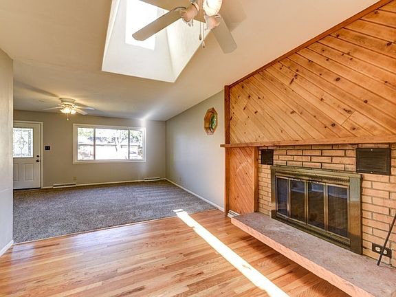 The remodeled kitchen boasts shaker-style maple cabinets, tile flooring, and modern finishes that complement the warm hardwood floors throughout the dining room and bedrooms. Skylights in the kitchen and dining area fill the home with abundant natural light, creating a bright and inviting atmosphere.