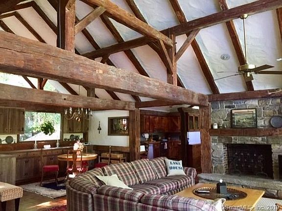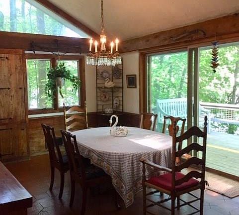 Unique, lakefront, rustic-chic home located in a private lakeside community. This one-of-a-kind home offers two large open concept living areas, three bedrooms, two and a half bathrooms, two gas fireplaces, and bonus kitchenette on lower level. Full length deck and patio overlooking lake and private dock. Beautiful views from every room! This property can be fully furnished or unfurnished. There is a two-car garage, washer/dryer and central air. Enjoy lakeside living at its best with 5 private beaches for your enjoyment. And a hot and cold outdoor shower .