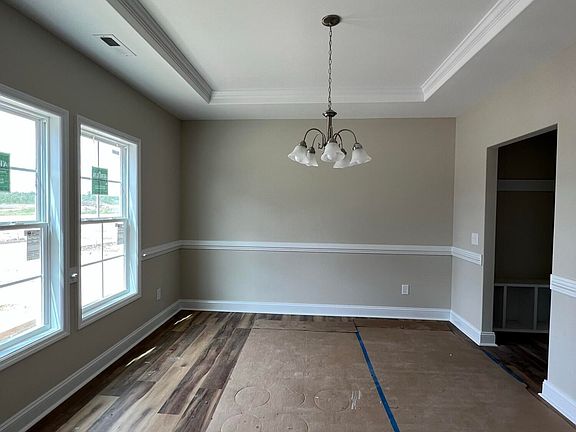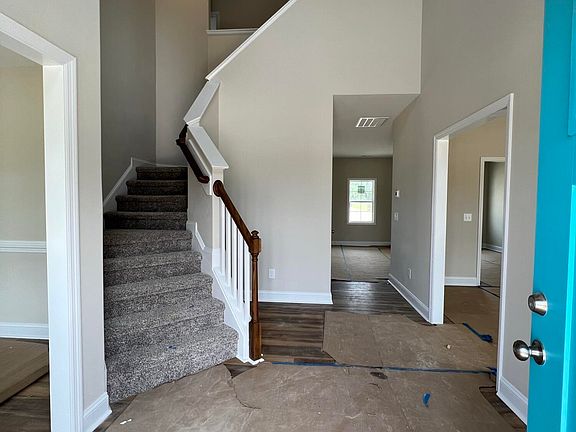 The Brookstone presents itself with a classy curb appeal that includes a front bump out. Adding to the elegant appeal is a stately yet inviting covered front porch with a welcoming front door that leads into a grand foyer. Upon entrance into the 2880 square foot home, that sits on over an acre of land, is a wide-open two-story foyer with hickory colored LVP flooring. The same flooring is shared with the kitchen, den, and dining room, and so are the neutral, soft gray walls creating a smooth flow throughout the home. Upon entrance from the garage is a handy coat bench. The dining area with a trey ceiling and a sophisticated white chair rail. There is also a half bathroom which mirrors the other three full baths with lovely white cabinets with brushed nickel pulls, and a cool neutral tile floor. Moving along is a sizable kitchen with ashen white granite countertops, fine white cabinets with brushed nickel pulls, and a handy breakfast nook with tall windows. Off the kitchen is an in-law suite, a warm and plush neutral-tone carpet, a full bathroom, and a walk-in closet. Shifting off the kitchen is the living room with an abundance of wide-open space, a door to another covered porch, an electric fireplace with white subway tile surround, one of the two entrances to the office/den, and a large picture window. Circling around to the front of the house again are the stairs to the second floor opposite the second office/den entrance. Upstairs has a sizable landing and entrances to an oversized laundry room with tile floors, and a massive bonus room. All bedrooms and stairs share the same lush carpet in neutral tones. Adjacent to the landing is also a full bathroom, remaining bedrooms, a hall closet, and the primary suite with an oversized closet and large bathroom.