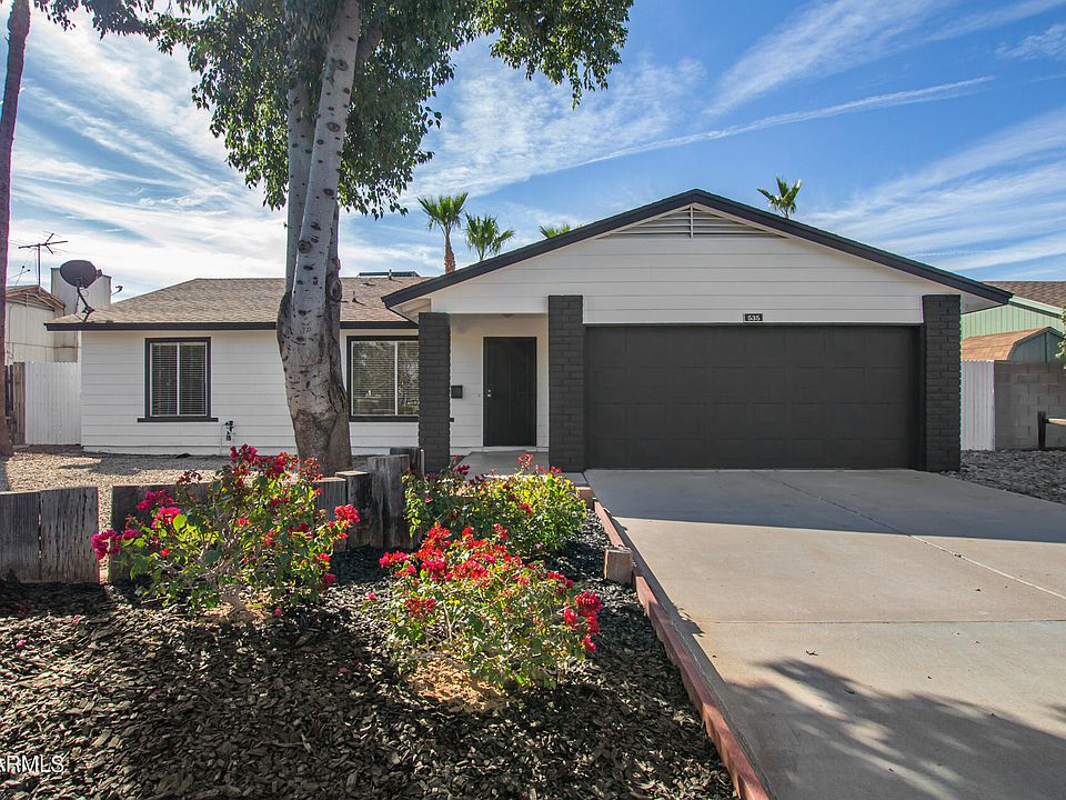 Remodeled 3 bed, 2 bath home with a 2-car garage! NO HOA. Spacious great room with sliding glass doors leading to the back patio. Wood-look flooring, vaulted ceilings, stylish light fixtures. Kitchen displays plenty of white cabinets, stainless steel appliances, solid surface counters, tile backsplash, and a great island. Updated bathrooms with new carpet in bedrooms. Property is across the street from a park and the location is perfect, near schools, freeways, Downtown Gilbert and Downtown Chandler!