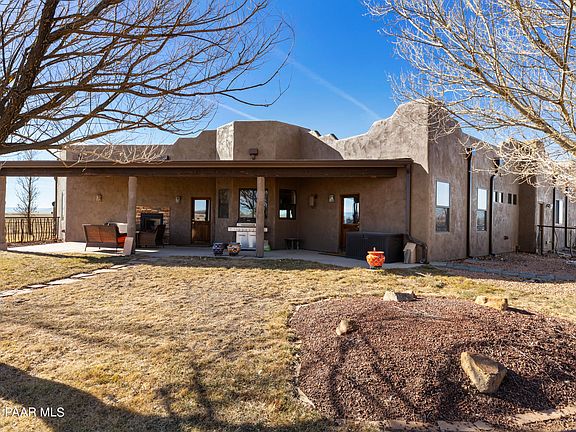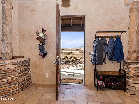 Rare opportunity to own a 8-acre Ranch in desirable Haystack Ranch in the Perkinsville area of Chino Valley. This Santa Fe style home has an open & warm concept connecting the living room, dining area & kitchen. Beautiful Spanish Tile adorns the kitchen & bathrooms as well as Hacienda style stone & peeled pole features & knotty hickory cabinets throughout the home. Custom features include the fireplaces in the Primary Suite & Living Room, hammered copper Kitchen sink & Talavera Bath sinks. Newer exterior paint & a 2022 roof. Horse facilities designed for Roping & Barrel racing include a 320' arena with 5 pens, a chute, tack building, 5 stall shelter w/turnouts, 2 pastures, great well & 8 acres fenced for cattle. Ride from your Ranch to State Land then onto the Prescott National Forest.