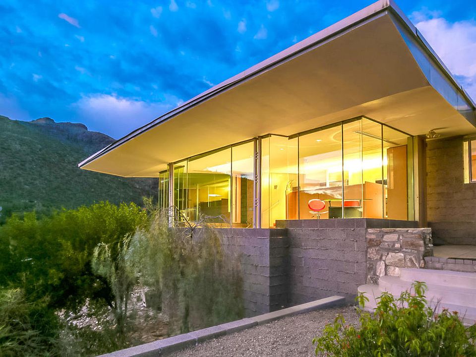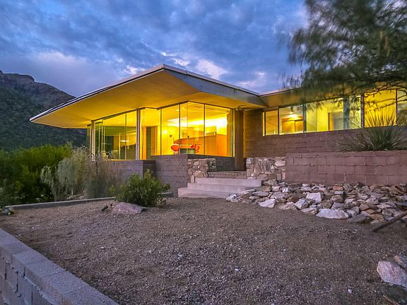 This architectural masterpiece is a unique one-of-a-kind gem designed by award winning architect Will Bruder, it's nestled at the base of the Catalina mountains. Naturally positioned in such a way that allows breath taking city, mountain, and sunset views from every angle and every room. The galley kitchen opens up above the step down living room, sharing the views of the entire Tucson valley from the walls of glass encasing this house. This home has solid masonry construction, weeping mortar walls, maple cabinets. Under the carpet you will find polished concrete floors. Enjoy TWO master suites with a third bedroom and hall bathroom for guests, several outdoor patios/sitting areas, a balcony off one master suite, a spacious 3 car garage, and a rock waterfall.