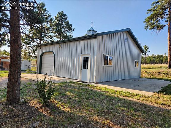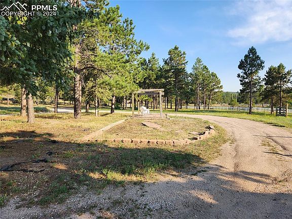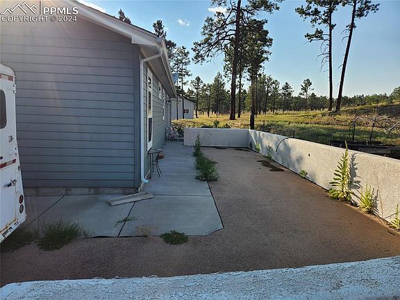 5-acre wooded property with ranch-style house, large patio, detached 900 square-foot garage with garage door opener, gazebo, 625 square-foot workshop with electricity and wood-burning stove. Property includes corral containing loafing shed and two fenced-in pastures for horses. Easy access to I-25 and Hwy 83.