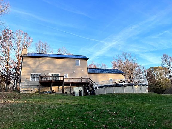 This stunning brick home sits on 5 acres of wooded land to create your own private oasis. It has updates galore with a brand new roof & gutters. A large front porch that is perfect for your family to watch the sunrise & set. The entry way flows into the beautifully updated kitchen that walks right out to a deck that over looks the swimming pool. New carpet in the upstairs bedrooms & on the stairs. The owner's suite has a large walk-in closet with extra sitting space off the bedroom. New flooring was placed in the owner's bath & a brand new vanity. The walkout lower level has an extra living space with a kitchen, wet bar & another bedroom with full bath! This home also has a detached building that is great for storage, cars, etc. If you are looking for peace & nature this house is for you!