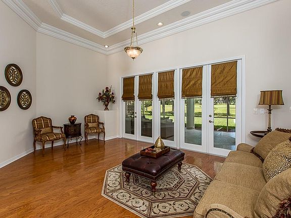- Ceiling Fans(s), High Ceiling(s), Master Bedroom Downstairs, Split Bedroom, Crown Molding, Walk-In Closet(s), Window Treatments, Open Floorplan, Solid Wood Cabinets, Kitchen/Family Room Combo, Stone Counters, Tray Ceiling(s), Coffered Ceiling(s), Thermostat