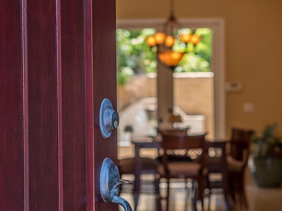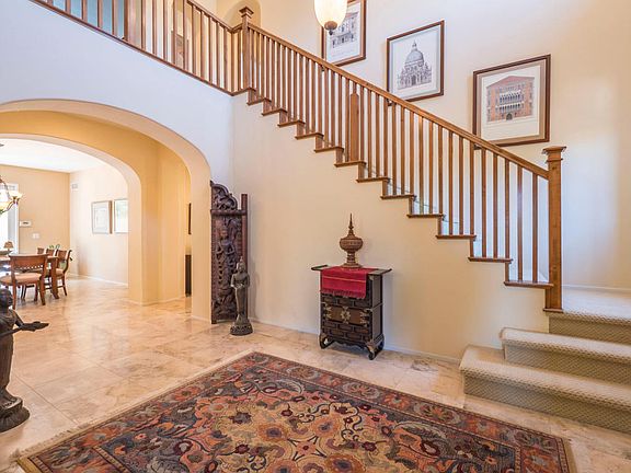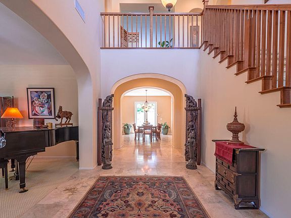 The Gallery at Dos Vientos. The gated courtyard entry graced by 2 travertine fountains, welcome you to the perfection that awaits inside. This 4 bedroom, 3 bath, home also has a large upstairs library, study, or game room with a view of Mt. Boney. A Large soaking tub, separate shower with bench seating, and his and her walk in closets grace the larger Master suite. The secondary bedrooms are all large and have closet organizers. Downstairs bedroom is currently used as an office. Dual Vanities complete the secondary bathrooms. Gorgeous travertine flooring and sculpted Berber carpet. All windows have Plantation Style shutters. Kitchen has Granite Counters, with large eat in area. Formal Dining room has French doors that lead to the backyard of your dreams. Including a 7x20 heated and