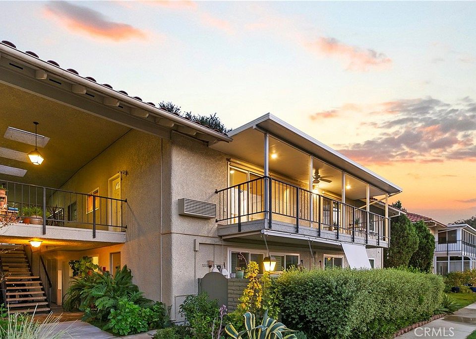 This is the perfect opportunity to make this Laguna Woods Casa Vista home your own! Beautiful view location to enjoy sunsets every evening from the large covered balcony with exterior ceiling fan. Upgraded kitchen with stainless steel appliances, including a trash compactor and 4 door refrigerator, granite countertops, wood cabinetry and custom skylights to make it light & bright. The spacious living room has a large dramatic built in electric fireplace, lighted niches and sliding doors to the balcony. A large dining area has room for most dining furniture. Travertine flooring, neutral carpet wood flooring throughout. Convenient in-unit stacked full size washer and dryer keeps laundry duties inside the home - no community laundry for this home! The primary bedroom suite has plantation shutters, a large walk in closet and upgraded bathroom with spa tub. Secondary bedroom has sliding door that opens to balcony. Large secondary bath has upgraded stall shower. One carport with storage is located directly across from the unit and best of all - no steps or stairs to contend with either inside our outside the home! Close to clubhouse and pool, too! All of this inside an amazing community with boundless activities and amenities. 27 hole championship golf course or the 9-hole executive par three courses, tennis, paddle tennis, pickle ball, lawn bowling, two fitness centers, seven clubhouses, five swimming pools, equestrian center, gardening opportunities, art studio, world-class woodshop, over 200 clubs and organizations! Buyer to pay $7500 GRF Facility Fee and $400 HOA transfer fee. Buyer must meet LWV financial requirements to purchase, visit www.lagunawoodsvillage.com for more information.