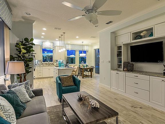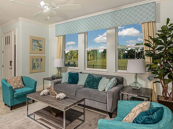 Your opportunity to own a showcase pond front model home is here! Gorgeous 2 bedroom/3 full baths with loft & a 2 car garage end unit has every upgrade & design feature you could ask for and has built-in features you cannot get with a new home! As you enter the home, you will see the thoughtful attention to detail this home has. Light & airy open concept floor plan features built in TV area complete with shelving & drawers. Crown moulding & ash wood plank ceramic tile flooring, & 5 1/4" baseboards adds to the elegance of this home. The kitchen features Whirlpool Stainless Steel kitchen appliances, granite countertops, tile backsplash, upgraded white cabinetry with glass insets & brushed nickel hardware & a built in wine rack. One of the best features of this home are that both bedrooms are downstairs. Owners suite features sliding glass doors to lanai, tray ceiling, expansive walk in closet & an en-suite bath that features his & hers sinks with glass inset upper cabinetry, separate water closet, a super shower & more storage with a linen closet. On the way to 2nd bedroom, you will find more built in shelving & storage enhancements. The 2nd bedroom is also located on first floor is next to the second bathroom with upgraded shower tiles & laundry room features cabinetry as well. As you ascend the stairs, white picket banister highlights the upgraded carpeting leading to the loft area that also features a full bathroom. One of the best features of this home is the unfinished "Florida attic" storage space.