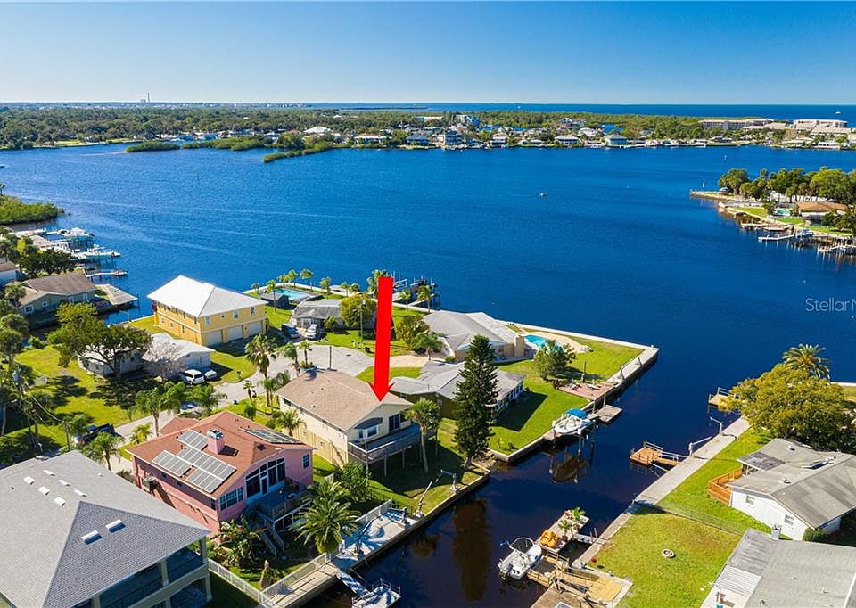 Keywest Style, Waterfront Home with a front and large back deck capture sunrise and sunset waterfront views. I have sold Million dollar coastal homes that do not have these veiws. 3 bedroom, 2 bathroom split plan which is great for company or home office. Great room style living area features bay window and access enclosed Florida room for year round use. Florida room leads out to the large back entertainment size deck. Fabulous outdoor space. Inside laudry room. Updated custom kitchen with granite countertops. Large Master bedroom ensuite bathroom with tub and shower. Walk in closet with attic access for additional storage. Master bedroom has direct access to large back deck. Front Guest Bedroom/Office has direct access to the front deck with new high impact doors. Arched clerestory window over double front doors flood the entrance hall with light. 2 Hall closets give great additional storage where it is really needed. Huge garage space under home allows up to 4 vehicles or boat trailers with Tandem parking. Current owner had all the toys and a nice workshop in this space. Seawall is being repaired. Davits do not work, they do not convey in working condition. MUST SEE THIS ONE!