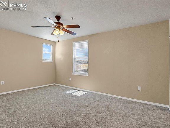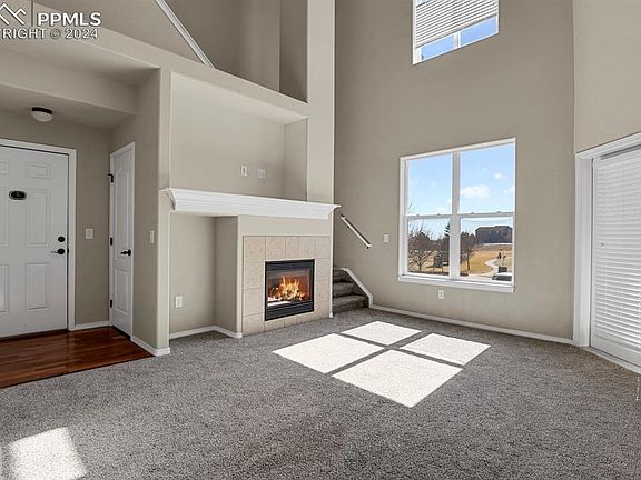 Exquisite End Unit with Breathtaking Park Views and Pikes Peak Panorama. Discover the epitome of serene living in this rare, end-unit home, with exceptional blend of tranquility and convenience. Featuring 3 generously sized bedrooms and 2 full bathrooms, this residence is a perfect sanctuary for those seeking quietude while remaining connected to community amenities. Nestled within a peaceful complex, this home is just a short walk away from top-rated schools, diverse dining options. There is a park for young children that can be seen from the balcony. This unit is composed of the 2nd and 3rd floors. This property impresses with two master suites, one conveniently located on the main floor, complete with a full bathroom. The second master suite graces the upper level, accompanied by a full bathroom and an oversized loft, offering versatile living spaces. 20 ft vaulted ceilings that enhance the spacious feel. Under stair storage and a coat closet. The laundry room on main level doubles as a food storage area. A gas fireplace will keep you warm during the winter months. Newly installed carpet throughout, adding warmth and a fresh feel to the home. Both master bedrooms feature walk-in closets, ensuring ample storage space. The dining area provides a cozy setting for meals - along with extra seating at the breakfast bar. There is also a elevated landing where you can house plants and receive direct light from the vaulted ceiling window. A single car garage (not attached) with a brand-new door adds to the appeal, ensuring your vehicle is secure and sheltered. Offering a blend of peaceful living with the convenience of urban amenities. Whether you're basking in the Pikes Peak views from your large balcony, enjoying the natural light flooding through the vast windows, or entertaining in the spacious dining area, this home caters to every need with convenience and ease. Don't miss out on this unparalleled opportunity to make this tranquil retreat your new haven.