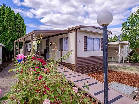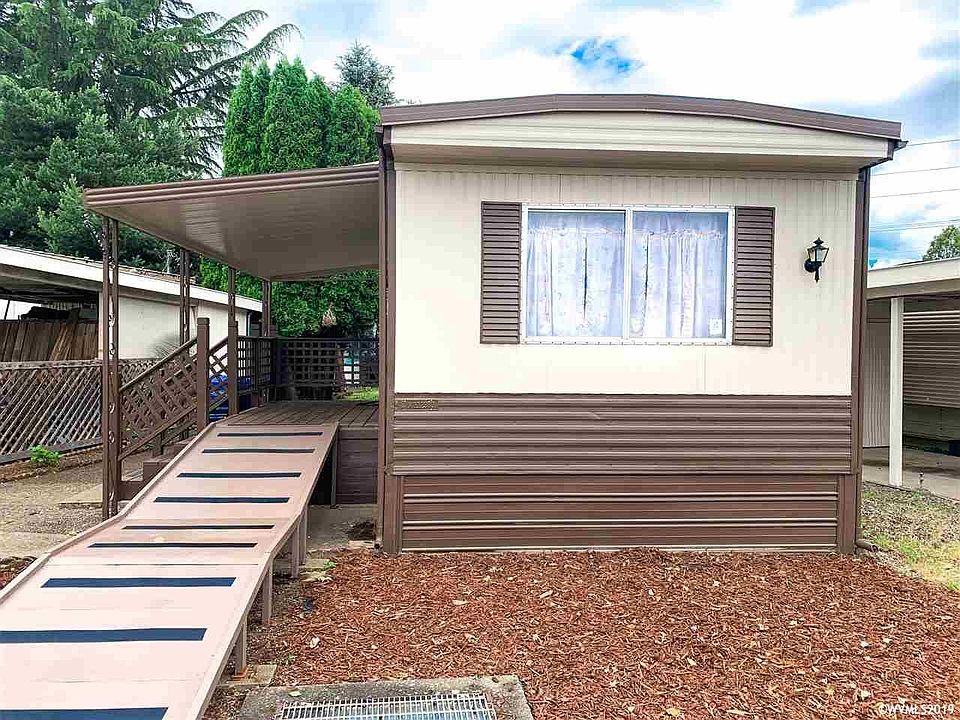 55+ living in McNary Oaks. Move in ready with updates! Home features a wheel chair ramp, updated electrical, new hot water heater, new furnace, and a brand new bathroom. Large living room with all rooms in the back of the home. Fresh paint inside and out. New rubber membrane roof. One car carport with extra storage. All appliance are included in the sale. Space rent is $706 a month and covers water, sewer, garbage, and swimming pool.