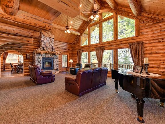 MAJESTIC CUSTOM LOG HOME on 19+ Serene Acres! Spectacular Sunset Views! Hand-hewn logs from Montana and So. Canada by Amish-family owned, Meadowlark Log Homes. Awesome cathedral log-beam ceilings. 2-story wall-of-windows for distant Westerly views, plus beautiful views from every window. Comcast high-speed internet; gigabyte service available. Handicap-accessible entry for both main level and 1st level. MAIN LEVEL: master suite with Jacuzzi soaker tub; kitchen & dining room; laundry room; powder room; great room with large eco-friendly fireplace & burl mantle. LOFT LEVEL: living room; dry heat sauna; 2 suites, ea. with Jacuzzi soaker tub/shower. 1st LEVEL Private Quarters: living room & dining combo; kitchen; laundry; 2 bedrooms & bath; private entry & deck; perfect for long-term guests or multi-gen living. Automatic front gate, 20 kw auto-start generator, solar system (owned), deep garage bays, fenced garden with 13 fruit trees & shed. Easy access to shopping. Jenkinson Lake 3 mi.
