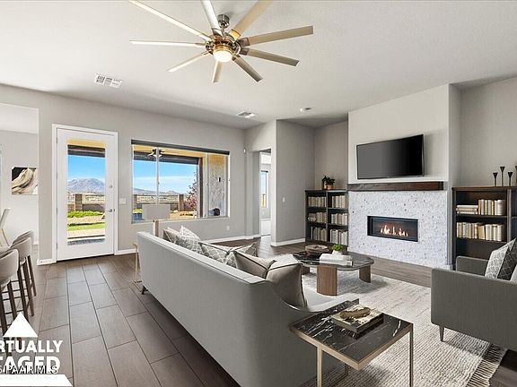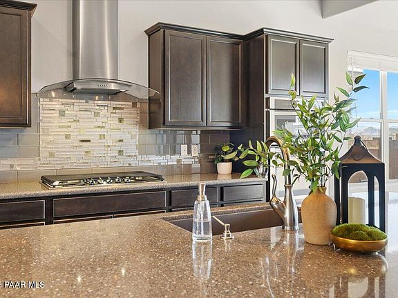 Perched in the heart of the Tri-City area, this exceptional 2017-built home in Granite Dells Estates captures the beauty of the surrounding granite formations and offers refined modern living at every turn. A paver driveway and pristine, low-maintenance landscaping frame the contemporary stucco exterior, while the clean architectural lines and private courtyard entry set the tone for the sophistication that awaits inside.Step through the entryway to find a spacious living area bathed in natural light. A large picture window perfectly frames views of the Dells, while a sleek horizontal gas fireplace with a white rock surround and mantel adds warmth and style. This inviting great room provides the ideal setting for both relaxation and entertaining.The open-concept kitchen is a culinary delight, featuring quartz countertops with elegant bullnose edges, a stylish backsplash, and a suite of stainless steel appliances, including a five-burner gas cooktop, separate wall oven, and French door refrigerator. A walk-in pantry and reverse osmosis system add everyday convenience, while the adjacent dining area, surrounded by windows on three sides, floods the space with sunlight and showcases panoramic views of the Granite Dells.The primary suite offers a serene retreat with a cozy bay window and ample space for a sitting area. The spa-inspired ensuite bath includes a generous walk-in shower with decorative glass tile insets, dual vanities, and a spacious walk-in closet.On the opposite side of the home, you'll find a well-appointed guest bedroom with a slider closet, a stylish full bathroom with a tile-surround tub and shower combination, and a versatile den that can serve as a third bedroom or home office, complete with private access to the front courtyard. A thoughtfully designed laundry room with upper cabinetry adds extra functionality.Outside, the backyard is a peaceful haven where you can unwind and enjoy the breathtaking panorama of the Dells and surrounding Granite Mountain. With its 3-car tandem garage, soft water conditioner, and easy-care landscaping, this home blends practicality with elegance.Experience the perfect balance of modern design, comfort, and natural beauty, all in one of the area's most sought-after communities.