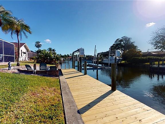 Calling all Boaters & Cooks! This Yacht Club Gem has all that Cape Coral Waterfront has to offer and kitchen that would make any chef envious of. From the moment you drive up to this home you will appreciate the Florida Charm it has to offer; this West Facing, Direct Gulf Access home is situated on a cul-de-sac neighborhood that displays pride of ownership. Exterior features include a new electric heater for enjoying the pool all year round, sprinkler system, newer roof, newer AC, a refreshed dock with boat lift ready for your evening sunset boat rides. Extended lanai, is perfectly situated to take in the sunsets and large enough to entertain any sized party. Once you walk in the front door you will be greeted by the custom island kitchen with solid wood cabinets and quartz countertops and all the features; Top of the Line appliances include a double oven, stainless steel fridge, dishwasher, and smooth top cooktop with pot filler,sink R/O. The double island offers storage for all your cooking gadgets. Other features include porcelain wood look tile, 3 updated bathrooms, new windows, hurricane screens, in house laundry and so much more, Do not wait. make your appointment today!