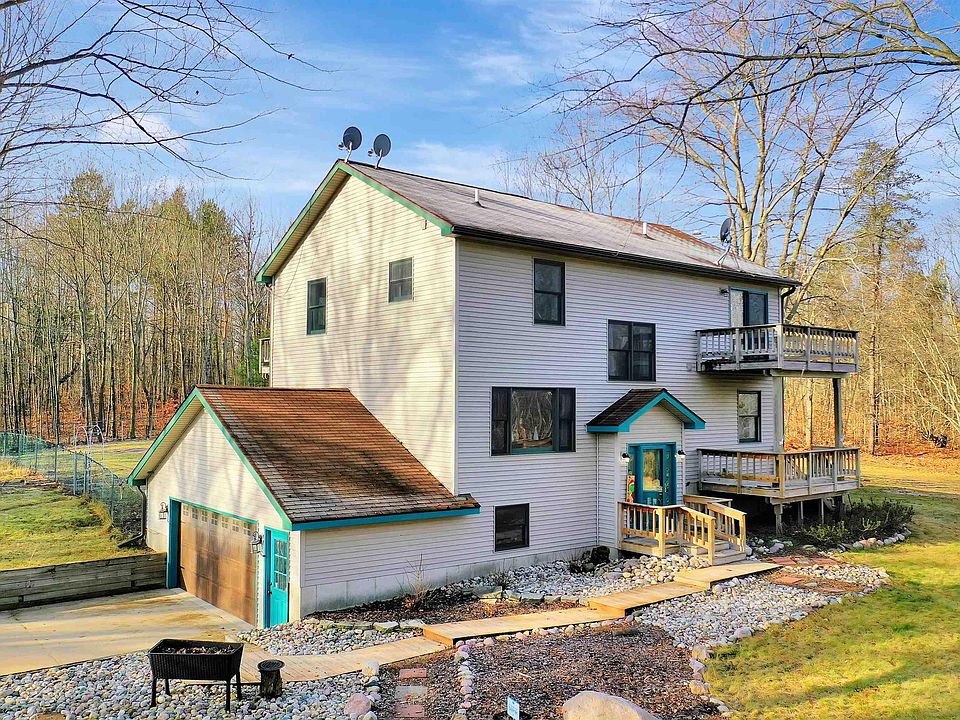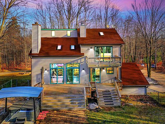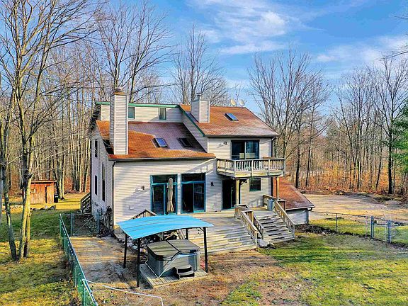 PRICE REDUCED... Welcome to your homestead oasis! Exceptional three-bedroom, three and a half bath, two-story home on five private wooded acres, just east of Cadillac. Spacious foyer entrance leads either up to the main floor living areas or down to the finished basement. Enjoy a large open kitchen with eat-in bar, newer black stainless steel kitchen appliances, and full pantry. Charming farmhouse kitchen is open concept flowing into the separate dining room space, and a sliding glass door that leads out to the back deck. Gorgeous living room area with knotty pine cathedral ceilings, extra-large windows and multiple skylights that provide tons of natural light. There is a wood-burning fieldstone fireplace in the living room that gives the entire space a warm and cozy feel. Upstairs, enjoy the huge master suite with gas fireplace, dual closets, as well as a large private bath with double vanity. Lower level has a fantastic newly finished family room. There is also a fourth non-conforming bedroom/home office on the lower level as well as another bathroom with a footed soaking tub. Fresh paint throughout. The home has a two-car attached garage as well as a 24x32 pole barn that is insulated, heated, with water, and electric. Outdoors, plenty of space for anything and everything! Back deck, three balconies, all with scenic views. The fenced backyard has plenty of space for kids and pets. Plenty of open space for a hobby farm or garden area. Covered hot tub is included in the sale as well. Seller has put more than $40k of improvements into this property in the short time that they’ve owned it: new water heater, tree removal, covered gutters, mini splits for additional heat and A/C, driveway, garage improvements, and family room updates. Located close to snowmobile and cross-country skiing trails, as well as the lakes and just a short drive into town! Immediate possession and move-in ready.
