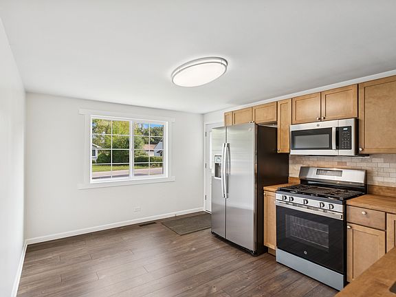 This beautifully remodeled 3 bedroom, 1 bath ranch has been updated from top to bottom. Step inside to a stunning new kitchen featuring sleek oak cabinets, butcher block countertops, a stone backsplash, and brand-new stainless steel appliances. The spacious eat-in area easily accommodates a dining table. New wood laminate flooring flows seamlessly through the kitchen and living room, where a brand-new sliding door leads to the side deck. All three bedrooms feature fresh carpeting, while the updated laundry room includes a side-by-side washer and dryer with extra storage space. Every detail has been refreshed with new white interior doors and trim. The exterior is just as impressive, boasting new LP Smart Siding, a new front door, garage door, and opener. Additional upgrades include: All NEW roof, furnace, A/C, plumbing, sealed driveway, and electrical service (including panel, outlets, and lighting, all updated to code). A 2-car detached garage and generously sized yard complete the package. Located on a quiet street down the road from Round Lake/Beach and minutes to shopping, dining, and the Metra, this home truly has it all. Nothing left to do but move in and enjoy!