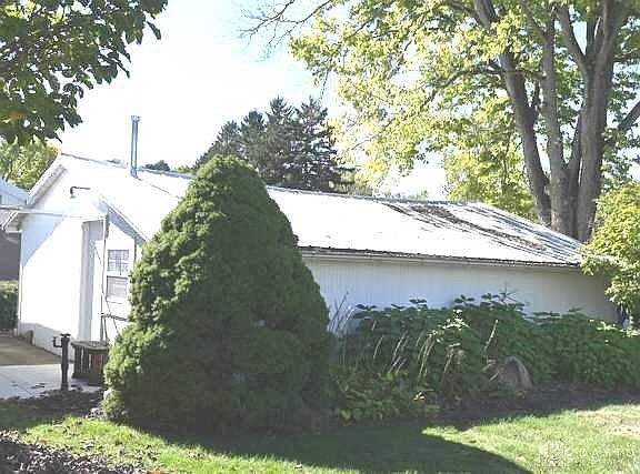 The property includes several outbuildings offering exceptional utility and storage. The former carriage barn has been converted into a 3-car garage with loft and additional storage room on the west end, measuring approximately 22' x 44'. The barn features a metal roof installed in the early 1970s and metal siding added approximately eight years ago. A separate 24' x 30' frame workshop includes a metal roof, American Standard natural gas furnace, Cutler Hammer fuse box electrical service, multiple outlets, workbenches and an in-wall air conditioner. The workshop also features a 10' x 15' lean-to storage area on the west end. (Note: no water line to spigot.)
