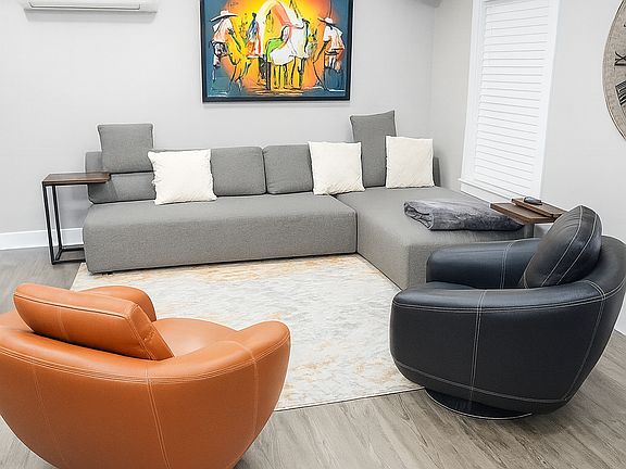 Upstairs, the spacious bedrooms are thoughtfully designed for privacy and rest. Each room features comfortable bedding, designer details, and ample closet space. The bathrooms are sleek and spotless, with hotel-style finishes and fresh linens provided for your stay.