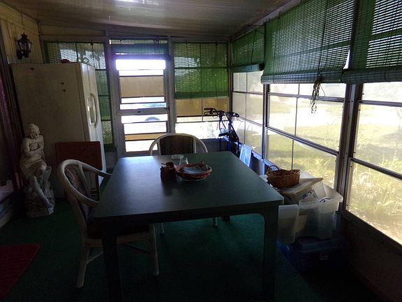 This a large "turn key' double wide located within walking distance of a pool and recreation hall. The home features newer laminate flooring throughout and the use of eclectic paint throughout. A galley eat-in kitchen has a pantry and flows into the formal dining area with a built-in china cabinet. The large living area has a pair of sliding glass doors giving access to an enclosed sun room with a view of the neighborhood. The master suite has a walk-in closet, and an en-suite with a separate vanity/dressing area. The guest bedroom also has a closet, and a guest bathroom across the hall. At the back of the carport is a storage shed that houses the washer/dryer and provides plenty of storage. Other features of the home are the 2013 central A/C unit; a metal roof that has been sealed recently; and an extra long driveway that could easily accommodate three vehicles. In addition, a breezeway between the house and shed has enough space to park a golf cart. This home includes furniture and furnishings, AND is priced to sell!! Located in the age qualified community of Colony Cove. Lot rent is $725.