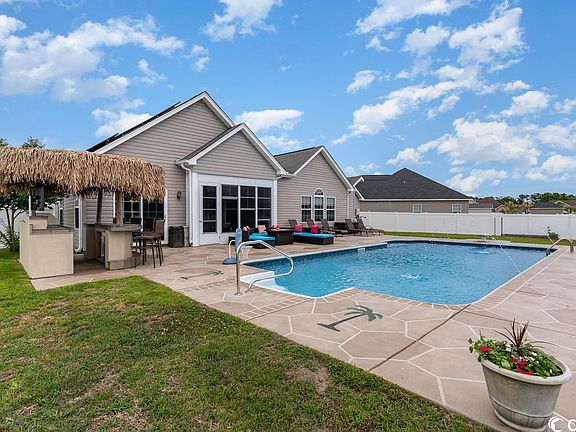 Enjoy peaceful living in this enchanting 4-bedroom, 2-bathroom home located on a large cul de sac lot in the highly sought-after Forestbrook Preserve community. This one-level home features a magnificent floor plan with luxurious upgrades that blend perfectly together to create a very warm and welcoming space. The semi-open concept main living area features hardwood flooring, a cozy, dramatic 9-foot two-step tray ceiling with ceiling fan and brilliant recessed lighting. The family-friendly kitchen is equipped with a smooth flat-top range, built-in microwave and fridge, and showcases granite countertops, cabinets with crown molding, a breakfast bar & nook, pantry and a formal dining area. The master bedroom features a vaulted ceiling with fan, stunning natural light from triple-double windows crowned with a palladium window, and private access to the master bathroom with water closet, walk-in shower, garden tub and matching his and hers walk-in closets. This home is completed with three additional bedrooms, a full second bath and laundry room. Off the back, there's a quaint screened-in patio that opens out to your own oasis revealing a 18 x 36 salt water pool, a covered tiki bar and outdoor kitchen and still plenty of space left for family activities, relaxing and entertaining! This home is in the highly sought after Forestbrook school system and in close proximity to Myrtle Beach restaurants, shopping centers, the beach and all that Myrtle Beach has to offer! Call your agent to schedule your in-person tour!