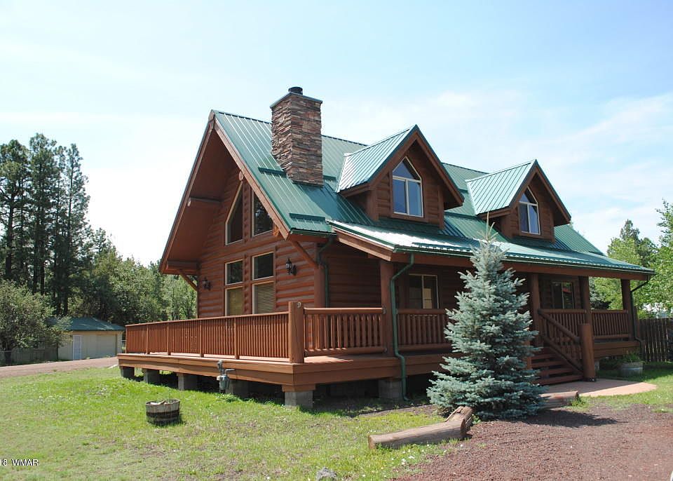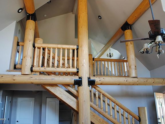 Whisper Creek log home. On 1/3 acre with views of Rainbow Lake. Large two car garage on a corner lot with plenty of parking. Covered porch in front and large wrap around deck and views on all sides. House has a metal snow roof and a balcony. Kitchen as granite countertops and custom cabinetry large pantry and eating bar. Great Room with floor to ceiling fireplace and log beams and log stairs give the feeling of a lodge. Forced air and heating natural gas. Log accents through out.