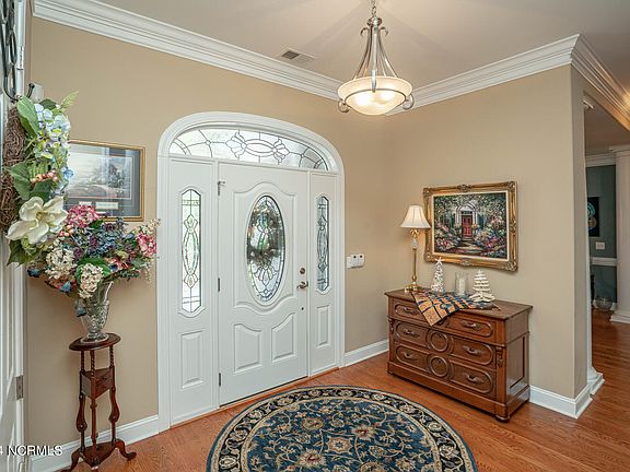 Beautiful inside and out. This custom-built brick home by the highly respected Ernie Crews Construction has it all. Allow us to entice you with some highlights. No detail was overlooked from the custom mill work, rounded corner walls, and custom cabinetry throughout. As you walk into the foyer, you'll notice the beautifully maintained hardwood floors in the main living area and the formal dining room (with trey ceiling) on your left. The living room beckons with its vaulted ceiling, wall of windows and built-ins centered by a gorgeous gas fireplace. A large kitchen with custom cabinetry offers plenty of storage space, a separate pantry closet, and access to both the screened in porch and the open back porch. The primary bedroom also has access to the screened in porch to enjoy your favorite beverage while taking in the nature view. The primary bath has a huge walk-in tiled shower with both rain head and wall-mounted and hand-held shower heads, dual sinks, and a jacuzzi tub. There are two additional bedrooms on the main floor and an additional bonus room upstairs with its own bath. Upgraded 40 year Architectural Certainteed Pewter Grey roof. Three zones for the house for optimal efficiency and lower electric bills - Main floor, Primary Bedroom, and Great Room on separate zones. home is located on one of the most popular and tight-knit streets in all of Ocean Ridge with its social groups/activities right on your street. Ocean Ridge Plantation is widely regarded as the premier community in Southeastern NC. Something for everyone-4 golf courses, 2 golf clubhouses, a heated indoor pool, sauna, steam room, jacuzzi, fitness center, outdoor pool, pickleball courts, a nature pavilion, a community garden, trails, 65+ social clubs, and the beach clubhouse on the award winning Sunset Beach.