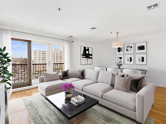 Exceptional for its expansive, open living and entertaining space, incredible New York City views from all rooms, and tasteful updates throughout, Residence 506 at Gotham Square is a brilliant two bedroom, two bathroom with in-building garage parking for one car that is flawlessly laid out over 1180 SF. It is perfectly positioned in the center of downtown Hoboken two blocks to NJ Transit express buses that service New York City's Port Authority and is an easy stroll to Hoboken Terminal (PATH, NY Waterway Ferry, Light Rail, NJ Transit) in addition to an exciting array of boutique shopping, dining, coffee shops, farmers' markets and parks/playgrounds that make The Mile Square City so special. Sunlight streams through three oversized windows that encompass an extraordinary living and entertaining space that comfortably accommodates a separate dining area, allowing for uncompromised, easy living day-to-day and effortless entertaining of family and friends. This space is anchored by an open kitchen with rich espresso millwork, quartz countertops, full suite of Bosch and LG stainless steel appliances, and a peninsula with bar seating. The primary bedroom suite exists to provide much needed privacy while it pampers with a spa-inspired bathroom with floor-to-ceiling tile and walk-in shower, and a oversized custom closet. The second bedroom offers great flexibility and ample storage it is perfect for use as a guest bedroom, children's bedroom or office/WFH space. A crisply appointed guest bathroom, central air conditioning and heat, in-residence washer/dryer, generous entry closet, in-building exercise room and Butterfly MX virtual doorman system make life at home a true pleasure. Available 3/1. 1.5 month security deposit. Sorry, no pets. Some images are virtually staged.