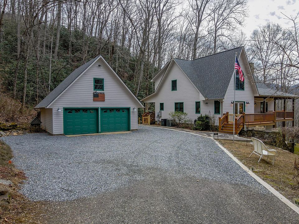 Serenity & Privacy abound in this amazing 8 acre property!Walk out the front door and you are hiking in National Forest! It's in the details...and this home has it both inside and out. The natural light from the large windows shows off the gorgeous hardwoods and allows sweeping views of the woods & mountains. Kitchen is wonderful for cooking & entertaining, large island & granite countertops. The seamless transition to the great room & dining area is perfect. Cathedral tongue & groove ceilings, hardwood floors and soaring fireplace. Primary bedroom is on main level with luxurious bath.Upstairs oasis sports a large loft, bath and two bedrooms. Let's not forget the downstairs! Large area for family room, another room for office, workout, etc. Detached oversized 2 car garage with upstairs storage! Front & back covered decks, garden area, small creek, It is truly your private mountain retreat! If you love nature, this one is a must see! Close to WCU and Sylva.