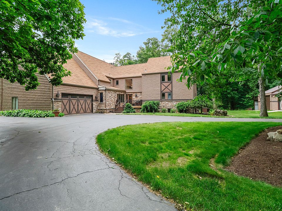 Experience the epitome of luxury living on this sprawling 9-acre estate! Nestled amidst picturesque landscapes, this remarkable home boasts 6 bedrooms and 5 bathrooms, ensuring ample space for your family and guests. Indulge in recreational activities on the multi-use court or take a refreshing dip in the pristine in-ground pool. Relax and enjoy the beauty of the pond. Entertain in style within the cedar pavilion, complete with a grand 17' fireplace, perfect for cozy gatherings. Embrace outdoor culinary delights in the outdoor kitchen. 2 car attached garage along with a 2,000 sq ft pole barn, there's ample storage for all your recreational gear and equipment. The grounds offer open space, wooded area, and a pond. Once you enter the home you will want to stay a lifetime. The heart of the home lies in the expansive main kitchen, that easily connects to the dining area and living area. The kitchen offers a wine fridge, ice maker along with an abundance of cabinetry. The kitchen is definitely designed with the chef in mind. Main level laundry for convenience in regards to the main home. The lower level is finished with an additional rec room, sauna, bonus room, and a private 400 sq ft mirrored gym for all your fitness needs. There is also related living area that offers a full kitchen with butler's pantry. Spacious living area, dining area and four seasons area that overlooks the park like grounds. An additional full laundry room is also located in the related living full suite. There are two ways to access the related living. Additional accessibility is key with lift/elevator ensuring convenience for all. Every detail of this home exudes luxury and functionality, promising a lifestyle of unparalleled comfort and sophistication. You've worked hard and deserve the best! Note: Large pond/lake shown on drone footage is neighboring property. Smaller pond is with property that is for sale.