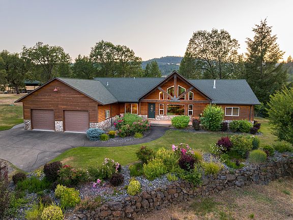 Welcome to Acosta Family Ranch & Estate, a serene 79-acre property with rolling terrain, pastures, mature oaks, & wooded areas. The 4-acre private knoll features a deer-fenced homesite including the estate home, shop w/guest quarters, barn, chicken coop, & garden space. The home showcases Northwestern charm with rustic wood beams, real log siding, & lush landscaping, while also boasting grand vaulted ceilings, an open floor plan, kitchen, 3 bedrooms, & 2 bathrooms. The backyard offers an inground pool w/an impressive rock water feature & hot tub. The guest quarters provide 1,400+ SF w/kitchenette, 3 bedrooms, & 2 bathrooms. The attached shop spans 1,200 SF plus a 50-ft long carport. The 3,300 SF barn is great for animals or equipment, 1,800-ft grass runway with hangar, & wood shed round out this feature rich property. The area has abundant wildlife like deer, elk, & bear, & offers hunting opportunities. Located near Shady Cove, this peaceful retreat is perfect for outdoor enthusiasts.
