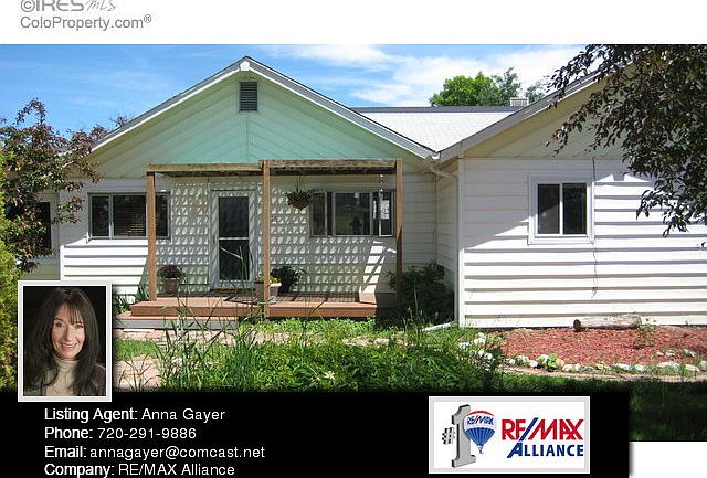 Rarely Available! Corner Ranch home with Front range views on one of the largest lots in the area. Country charm including retro kitchen to open concept D.R., L.R. with wood stove. Refinish real wood floors under carpet in Mstr. bedrm. Enjoy Summer from front or back decks and cool nights in your lush garden. New paint, carpets, kitchen counters, freshly stained decks. Bring your green thumb. 2-car detached garage & Lg shed off alley. This won't last! Smaller Sharpe Farm recently went for $242K Listing Agent: Anna Gayer Company: RE/MAX Alliance-Boulder Phone: 720-291-9886 Email: annagayer@comcast.net