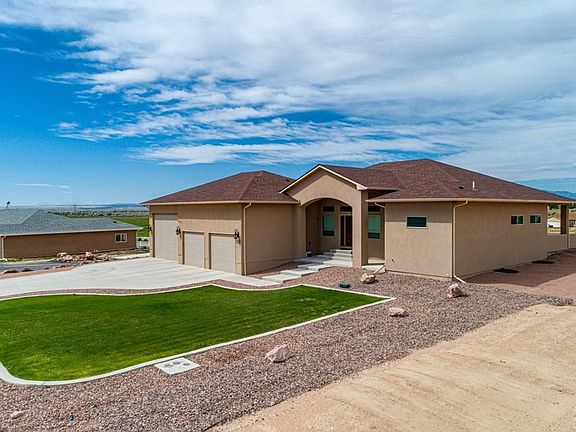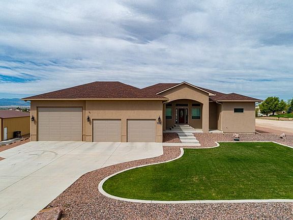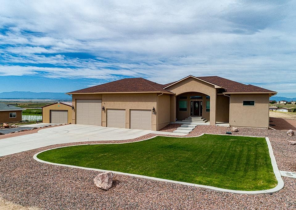 Don't miss out on this amazing home in Pueblo West Liberty Point that still shows like Brand New! No expense was spared on this Builder's own custom built home. Upgrades throughout, far too many to mention. Ranch style home with finished basement features 4 bedrooms (potential for a 5th), 4 baths, 4-car attached garage (with RV parking inside!) and a massive outbuilding that can easily fit all of your other toys. Main level features a great open floor plan with vaulted ceilings, gorgeous hand scraped wood floors and custom stone (gas-log) fireplace. Spacious gourmet kitchen includes custom soft close cabinets, extra large granite island and top of the line appliances. Enormous master suite with access to the covered rear patio. Bathrooms have beautiful copper sinks & tiled floors. You will love the spectacular mountain views from the kitchen & dining area. Finished basement is simply a must see! Features a big family room and Wet Bar with tile floors, granite countertops & custom cabinets. Basement also includes an exercise room, oversized bedroom and bathroom. Engineered truss system makes it a true open basement with approximately 10ft ceilings. Covered back patio includes a gas firepit and stucco wall. All solid wood 36" doors throughout. JELD-WEN premium series energy saving windows. Synthetic stucco exterior. This newer built home with nearly 5000 finished sqft is situated on a 1.26 acre lot. This home is the complete package you don't want to miss!