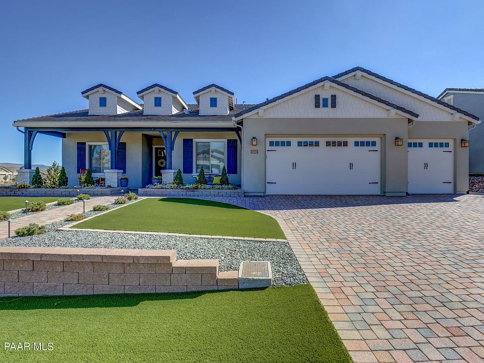 Gorgeous 4 bedroom - 3 FULL baths plus a Den! Mountain Views & Stunning Sunsets! This Home is in the highly sought-after Granite Dells Estates. Large, over 1/4 acre - end lot. Beautiful upgrades, plank tile flooring, quartz counters in kitchen and all 3 baths, gas fireplace, 10-foot ceilings in all rooms with stunning vaulted beamed ceiling in great room & kitchen, extended driveway with 3 car garage & Tool Shed. Large covered paved patio with oversized double sliding doors. Basswood Custom Bright White Blinds. Primary bedroom has large walk-in closet with laundry room access door-so convenient! Huge Kitchen with a large 9.5' x 3.75' kitchen Island perfect for gathering with a huge walkin pantry.Light & bright and open to the great room and dining area. 7 ceiling fans in the home.