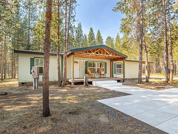 Welcome to the serene and sought-after Lazy River neighborhood in La Pine, Oregon! This charming 3-bedroom, 2-bathroom manufactured home, built in 1999, is nestled on a sprawling 1.47-acre wooded lot. With 1,494 sq ft of living space, this home offers an open and airy layout featuring high vaulted ceilings, a large kitchen with ample cabinetry, and a large bonus office/bedroom. The spacious primary suite includes a soaker tub, while the home also has a laundry/mud room with included washer and dryer. Step outside to enjoy the tranquility of nature on two expansive decks, both engineered and certified in 2021. Additional highlights include a newer large storage shed, an updated water softener system (2021), and a reliable 1,500-gallon concrete septic tank with sand filtration. The property also features a robust water well with a pump house and updated front entrance steps and patio. Experience the peaceful beauty of this wooded retreat—schedule your visit today!