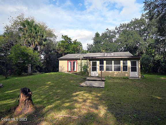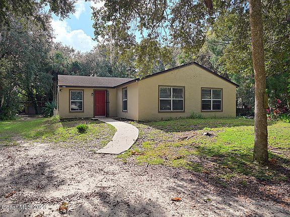 Amazing chance to reside in the highly sought-after Canaveral Groves! This home nestles on a private one-acre lot adorned with mature trees. Features Include: a spacious eat-in kitchen boasting a charming tile backsplash and stainless steel appliances, a generously sized Living Room flooded with natural light, a Primary Bedroom featuring French doors that open to the outdoors, a walk-in closet, and a primary bath equipped with a step-in shower. Additional highlights include: tile flooring throughout, framed window casing, crown molding, 5-inch baseboards, a delightful 19x10 Florida Room, accessible attic, a cozy fire pit perfect for gatherings, and a convenient laundry hookup. There also exists potential for a conversion into a third bedroom. Easy to show - Call Today