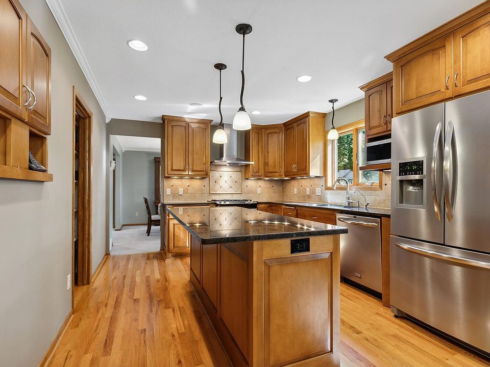 Beautiful and well-maintained home on large .66 acre secluded lot offering privacy and convenience. This home has an updated kitchen with granite countertops and SS appliances and large pantry offering tons of storage. Main floor bath has been recently remodeled. Main floor family room walks out onto large maintenance-free deck with a view of the beautiful, terraced gardens. Large backyard patio offers additional space for guests to mingle, paved parking spot next to garage offers additional storage space along with 2 storage sheds. Large owner's suite with private bath and walk-in closet. Four bedrooms on upper level, all generously sized. Lower level has a large light-filled rec room, full bathroom, fifth bedroom and has been drain tiled with sump pump. This home is conveniently located near walking paths, several community parks, shopping and all your favorite restaurants! This home is move-in ready and available for quick close.