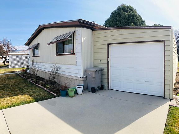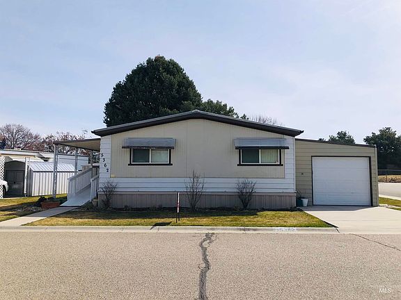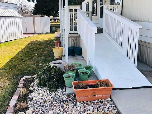 You will find pride of ownership in this large home! Located on a corner lot, in a quiet 55+ park that is centrally located to shopping & eateries. The home features 3 beds, 2 baths, & a large great room w/ vaulted ceilings, exposed beams, & formal dining area. Beautifully updated bathrooms have walk in showers with grab bars. Other features include covered front porch w ramp, newer metal roof, ceiling fans throughout, updated windows & custom window coverings as well as updated LED light fixtures. Open kitchen comes w/ SS appliances, fridge is LG & has double doors, glass top stove, hood vent, & dishwasher are also SS. There is a nice sized panty w large spice rack. Laundry room comes with a washer/dryer set. Stay dry & park in your 1 car garage that opens up into a 10x12 shed. Off the garage there is another ramp leading you inside. There is plenty of room to continue on the existing garden & enjoy the spacious yard. Community clubhouse w regular activities. This house is a Must See!!