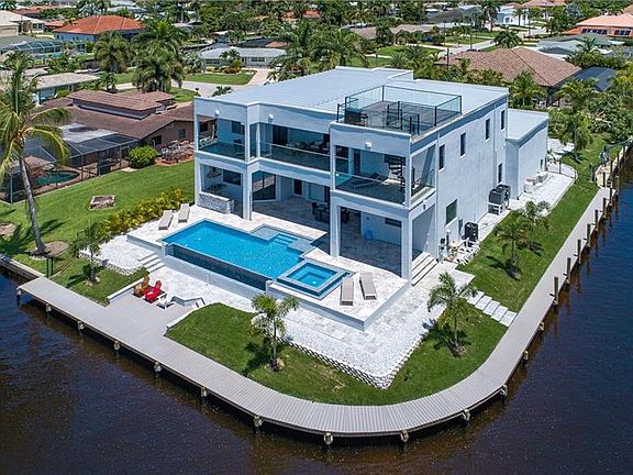 This brand new modern masterpiece is one of a kind! The river views over Cape Coral from the 3rd story rooftop will take your breath away! It features 5 bedrooms, 5 baths, 2 living rooms, an office/den, wine room, laundry room, 2nd story balcony, and 3rd story rooftop. If entertaining is your thing then you're going to absolutely love the giant pool area which features an outdoor kitchen/BBQ grill, outdoor shower, massive infinity edge heated pool with attached spa, "beach" area, tons of lounging space, and a wrap around 230' boat dock. Speaking of entertaining, the kitchen is immaculately equipped with state of the art stainless steel appliances and gas stove. There is a walk-in pantry with a separate fridge and tons of storage space. 3 refrigerators, Alexa/Google controlled thermostats, 8 smart TVs, Aqua-Link pool control and more, assures technical superiority. Custom upgrades include 3 fireplaces, outdoor tiled ceilings, stone walls, all impact windows and doors, pavered driveway with artificial grass in between, spiral staircase that leads to the 3rd story, glass railing, custom artwork, and much more. If you're looking for the ultimate in Cape Coral luxury, welcome home.