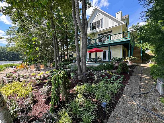 This property provides its owners with a unique northern Michigan waterfront living experience. The home’s architecture facilitates this experience by offering amazing waterfront views. These views function as a natural painting that adjusts to each successive season. The home’s immediate and intimate access to 100 feet of frontage provides its occupants with constant flow of wildlife and waterfowl. Deer roams the neighborhood, sounds of loons, ducks and other waterfowl can be heard from various rooms. What cannot be heard are the sounds of a busy and bustling city although one lies within a fifteen-minute drive. Main living area features an open concept, with lovely views of the lake and gorgeous Birchwood flooring. The kitchen offers a granite island and cherry cabinets including a buffet and coffee bar. The main floor Primary bedroom offers a lake view with a slider to the upper deck and a spacious walk-in closet with built ins and private bath. Upper level is where you will find 3 additional bedrooms, (one currently used as an office) views of the lake, a full bath with ceramic tile flooring. The landing on the upper level also is utilized as an office. The lower level with stamped cement floors and a full bath is excellent for entertaining, with a full kitchen, a large family room with movie theater, built in bookcases, two French doors to the exterior cement patio and a nice area at the water's edge for a fire. The lake side landscaping was just completed in 2024 and offers a wonderful array of flowering perennials. Full wrap around deck was just restrained and ready for entertaining. Fish and blooming water lilies open every morning with fresh blossoms and evasive maneuvers. Hundreds of miles of “two-track” trails stretch to the east and north and provide wonderful experiences for hikers, bicyclists etc. Come see the beauty and serenity this lovely property has to offer.