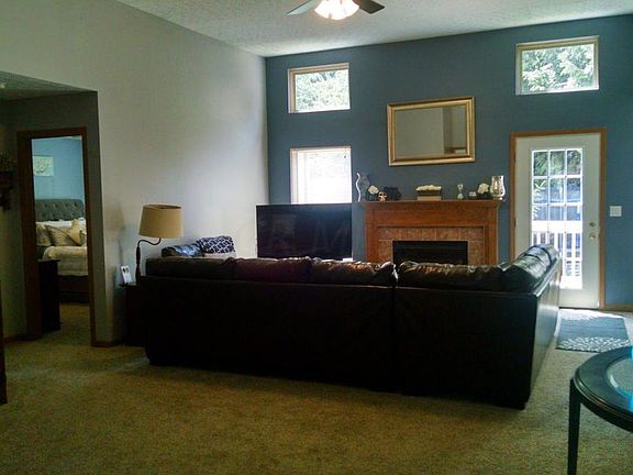 Don't miss this adorable split bedroom ranch home. Master suite on one side and secondary bedrooms and full bath off their own hall on opposite side of home. Eat in kitchen is open to cathedralled great room! The fire place is log wood burning or gas. Extra windows for more natural light! Master suite is quite large with double bowl sink, whirlpool tub, private shower, and walk-in closet. Nicely finished family room/play area in basement. Good storage. Separate laundry room with ceramic floor and shelving unit. New deck, new carpet and newly painted interior all since fall of 2016.
