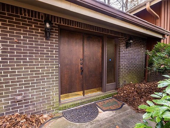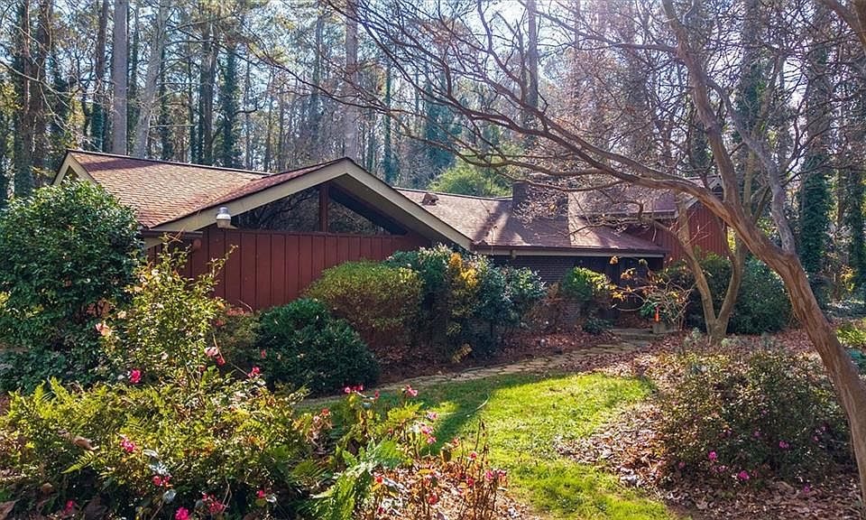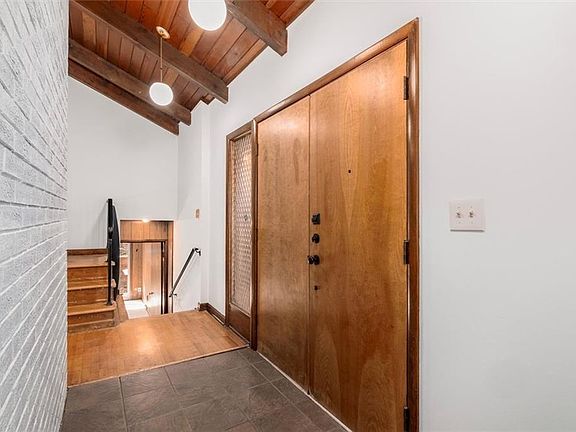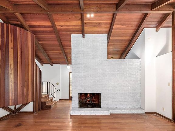 Cedar sided Mid Century Modern - one of a kind. Custom designed and built. Classic period features such as the bottle glass textured side light panel next to the front doors. A glimpse to the left and you will see the cylindrical redwood stairway to the upper floor. As you enter the great room, you will see a vaulted redwood ceiling, the last of the redwoods harvested for home building. The wall separating the foyer from the great room is floor to ceiling brick with a fireplace. There are original hardwoods throughout the upper and main levels. The great room has a view to the back yard through large sliders. The dining room is open to the great room, sharing the same vaulted ceiling with trapezoid openings at the top giving a feeling of a chalet. The dining room also has sliders bringing in a lot of natural light. Continue to the kitchen and you will see the door to the oversized garage at your right. The kitchen has tall cabinetry and an efficient design. The giant ball lights overhead are definitely period fixtures. Gas cooktop, Miele Dishwasher, oven with broiler are installed appliance. There is an updated counter and floor in the kitchen. A nook for laundry separates the kitchen from the foyer. The upper level has three bedrooms and two baths. Generous windows have a view of the woods at the side of the house. The primary bedroom has a window unit ac only because the owners like cooler temps in the bedroom. The lower level has a den with a walk out to a patio, another bedroom, a bath and an unfinished room that walks out to the side yard. The hallway has a horizontal wine rack to store your favorite vino. There is a tankless water heater servicing the home. The 1.19 acre lot is likely to surprise you in spring with flowers blooming from the owners gardens which were at one time a showplace. The oversized garage with a side entry provides lots of options for storage and use. Home is sold as is. It is freshly painted with new carpet in the lower level.