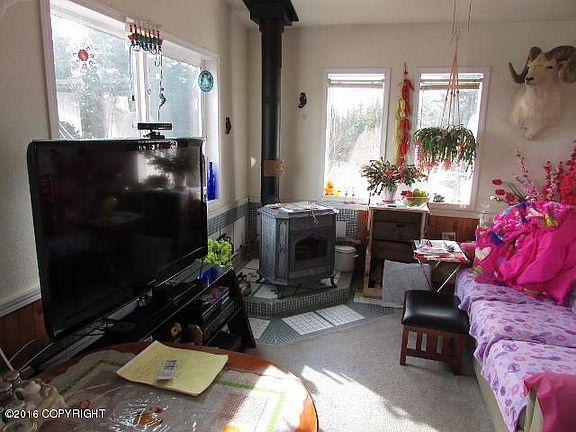 This home can be used as a duplex or as a mother-in-law apartment. Beautiful pond with geese, chickens & wild pheasants. Large garden area. Apartment downstairs bathrooms is currently being completely remodeled. Panoramic view of Kachemak Bay, Kenai Mountains & Glaciers.