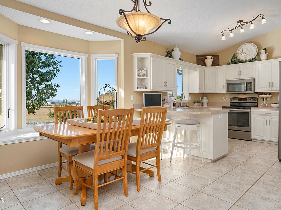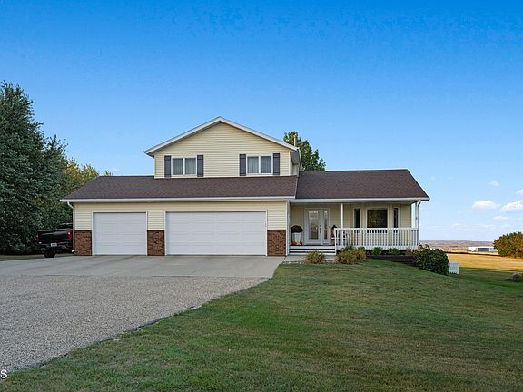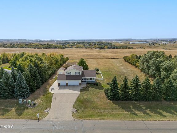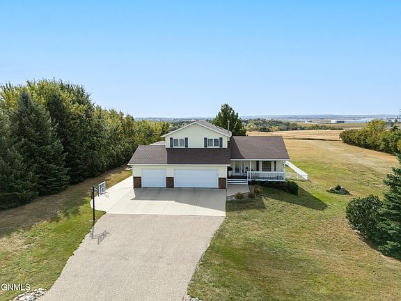 Enjoy country living just minutes away from Bismarck. This well-cared for home sits on nearly 2 acres. This home features a covered front porch, perfect for enjoying your morning coffee. The main floor has an open concept. The formal living room has newer Anderson windows, which offers an abundance of natural light. Kitchen features white cabinets, newer stainless steel appliances and dining room with bump-out window and bench. There is another living room with gas fireplace and patio door leading to the deck. There is a half bathroom/laundry room off the garage entrance. Washer and dryer are included. Upstairs includes a primary suite, 2 additional bedrooms, full bathroom with sky light. The basement includes 2 family rooms, 1 bedroom, bathroom, and utility room with additional storage. There is brand-new carpet in the basement. The deck overlooks a big backyard with beautiful plants and trees surrounded by a white picket fence (maintenance-free). There is also a nice patio area with fireplace. The 4-stall garage is heated with a floor drain and has plenty of overhead shelves for additional storage. The 42' parking pad allows for extra parking and leads to the 12x16' shed with a loft area. There is a nice garden area and plenty of room to build your dream shop! Other updates include: new roof (2023), steel siding, newer front door, and new garage side doors will be installed prior to closing. Call today to schedule a private showing.