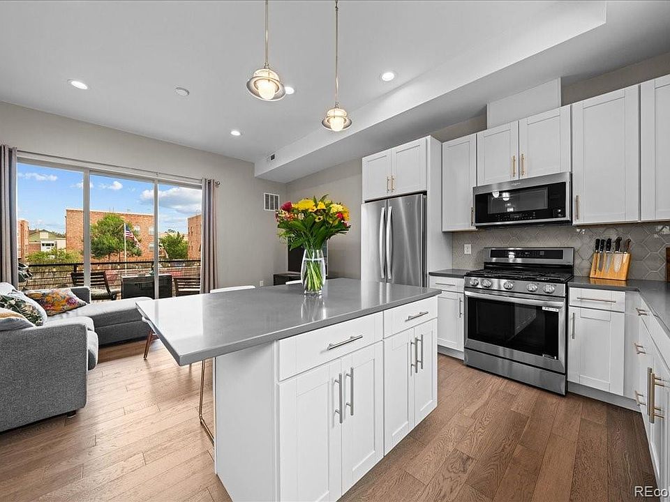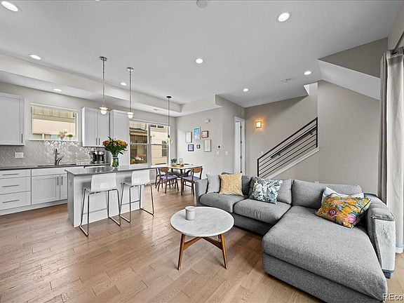 Welcome to this beautifully designed townhome offering a light-filled, open floor plan in a gated community just steps from the heart of Olde Town Arvada. With two spacious bedrooms and four well-appointed bathrooms—including a convenient half-bath located in the garage—this home blends comfort, functionality, and location. Natural light streams through generously sized windows, accentuating the rich wood flooring and enhancing every room with warmth and brightness. The modern kitchen features sleek quartz countertops, ideal for both everyday cooking and entertaining. Whether you're relaxing in the open-concept living area or hosting guests, the layout supports a comfortable and connected lifestyle.