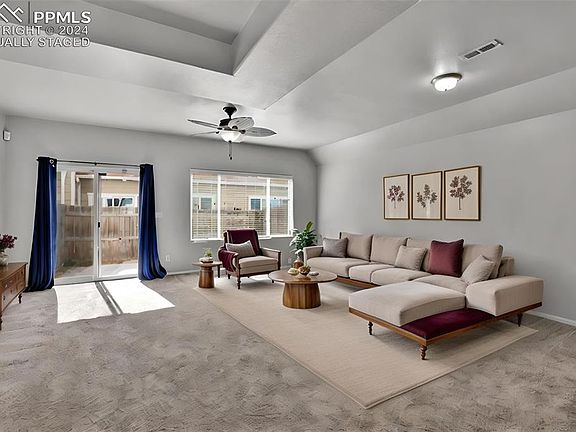 Desirable town home-AVAILABLE NOW! Covered entry & open main level concept with 9 ft ceiling. Kitchen boasts a generous amount of cabinets, a nice sized pantry, breakfast counter top/bar & more than enough counter space. All appliances included; range/oven, refrigerator, dishwasher, over the stove microwave & a front loader washer & dryer. Large dining room/living room area w/upgraded ceiling fan & walk out to a large enclosed/fully fenced patio area. Conveniently located powder room on the main level. As you approach the upper level, you'll find a huge loft area which can be used for children's play area, an office, a 2nd living room/family room, etc. Make your way to the primary/master bedroom w/adjoining 5 pc ensuite, featuring a soaking tub, double vanity & private water closet. The master bedroom also shows off a generously sized walk-in closet, ensuring ample storage for your wardrobe & personal belongings & upgraded ceiling fan. Laundry room is located upstairs, same level as the bedrooms for convenience, washer & dryer included. Second level also presents a spacious second bedroom, upgraded ceiling fan & a considerable sized full bath. The attached one car garage amenities; fully insulated, completely dry walled, garage remote/opener, extra space for storage & is located by the kitchen for convenience when unloading groceries. Newer central air & heat for year-round comfort. The property also provides an extensive driveway & the community has additional guest parking. Lowest priced HOA dues in Colorado Springs. HOA affords the following; landscape maintenance (landscape maintenance does not include enclosed rear fence area), snow removal, trash bin/service, management & exterior maintenance. Located near Colorado Springs Airport, Peterson Air Force Base, Fort Carson, Powers Corridor, easy access to I-25, shopping, restaurants, entertainment, parks & much more. This property will not last long-schedule a showing today!