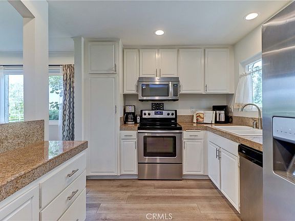 AMAZING VIEW! Ground level updated, end unit condo with bluff-top mountain view + peek-a-boo view of city lights and orange balloon! Check out the Matterport walk-through tour that includes interior and exterior areas. This condo can be purchased furnished for a truly move-in ready home! Located on a private cul-de-sac with just one building, very close to Clubhouse 6, and carport right in front. Airy and bright floorplan featuring dual pane windows/slider, mini split central zoned HVAC, vinyl plank flooring and smooth ceilings. Walk right in a be wowed by the natural beauty through every window! Updated and opened kitchen features granite tile countertops, recessed lights, stainless appliances and lovely window over the kitchen for morning sun. Great room area enjoys recessed lights, crown molding, mini-split, extra window plus sliding doors leading out to the mostly covered patio - gorgeous views and nice sized greenbelt area for your pets or grandkids to play. Primary bedroom is on the view side and brightened with mirrored closet doors, large window and finished off with crown molding. This room has its own mini-split for comfortable sleeping temperature and en suite bathroom housing glass enclosed tub/shower, nice sized granite topped vanity and updated fixtures. Guest bathroom features a walk-in shower with glass door, similar granite-topped vanity and updated bathroom fixtures. Guest bedroom is separated by the 2 bathrooms, has southeast facing window and mirrored closet doors. You'll love this inviting and beautifully upgraded home! Laguna Woods Village residents enjoy a 27-hole championship golf course, a 9-hole executive par 3 course, pickleball and tennis courts, lawn bowling, gyms, clubhouses, swimming pools, horse stables, gardening centers, artist studios, computer workrooms and classes + over 200 clubs and organizations. EXPERIENCE THIS HOME IN THE WALK-THRU VIRTUAL TOUR - CLICK ON THE WHITE CIRCLES TO WALK-THRU, 360 ICON TO GO OUTSIDE AND WALKING PERSON ICON TO COME BACK IN!