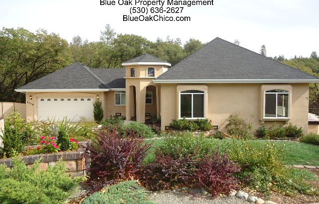 Blue Oak Property Management is offering for rent this 4 bedroom, 3.5 bathroom house located at 5367 Breezewood Dr in Paradise. House was custom built in 2011 and is very modern from 12 foot ceilings to open floor plan. Kitchen features grantie countertops, stainless steel appliances, bake center, dual gas ovens and gas range. This house has so much storage including walk in closet in master bedroom, monster size storage shed, under house storage room with electricity and RV parking. This house also features office, inside laundry room, formal dining room, family and living room, breakfast nook, and tankless hot water heater. Keep comfortable all year long with gas fireplace, whole house fan, central heat and air, and ceiling fans in every room. Enjoy amazing views from your balcony off the back of the house. Rent is $2000 per month and includes trash and landscaping. Security deposit is $2000 and pets considered with additional deposit (age and breed restrictions apply) Two pet maximum. Renters Insurance required. One year lease term only (owners will be moving into the property after lease expires). Available now.
