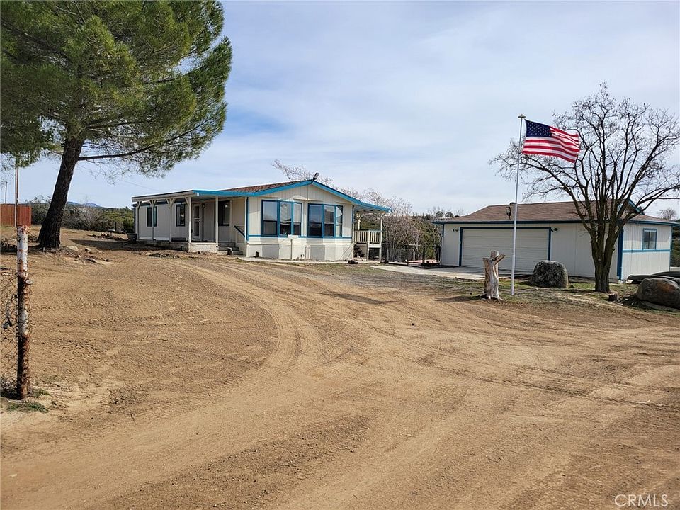 Updated home ready for new owner! Over 4 acres of land ready for so many possibilities. This home is perfect for someone looking for privacy & space. 1248 sq. ft manufactured home on permanent foundation (433 verified) with 2 bedrooms, 2 baths & updated throughout. Open concept living with kitchen, living & dining all together. Updated kitchen w/ white cabinetry, stainless steel & black appliances, solid surface countertops & generously sized center island. This home is light & bright throughout w/ large windows in every room. Warm tone, wood laminate flooring throughout (NO carpet!). Views from every room! Multiple areas to sit outside & enjoy the surroundings; Covered front porch, Covered back porch or expansive Deck off the detached garage. The 2 car detached garage has a 3/4 Bath installed. Perfect for someone who loves to get dirty outside! The 4+ acres is fenced, along with an additional fence around the backyard, for the safety of pets. This property is on a working well & has a 32,000 reserve tank. The well & septic were inspected & certified a year ago when the seller purchased the property and both in are in good working condition. 30 amp pedestal for a camper on the property. Lots of possibilities with this land. Easy to walk all around. Flat areas primarily, so perfect for additional outbuildings, perfect to bring your horses or perfect to ride around & enjoy your Toys. Gated entrance to the driveway gives added security, along w/ Solar lighting on the outside for night vision & safety. Come see this home TODAY!
